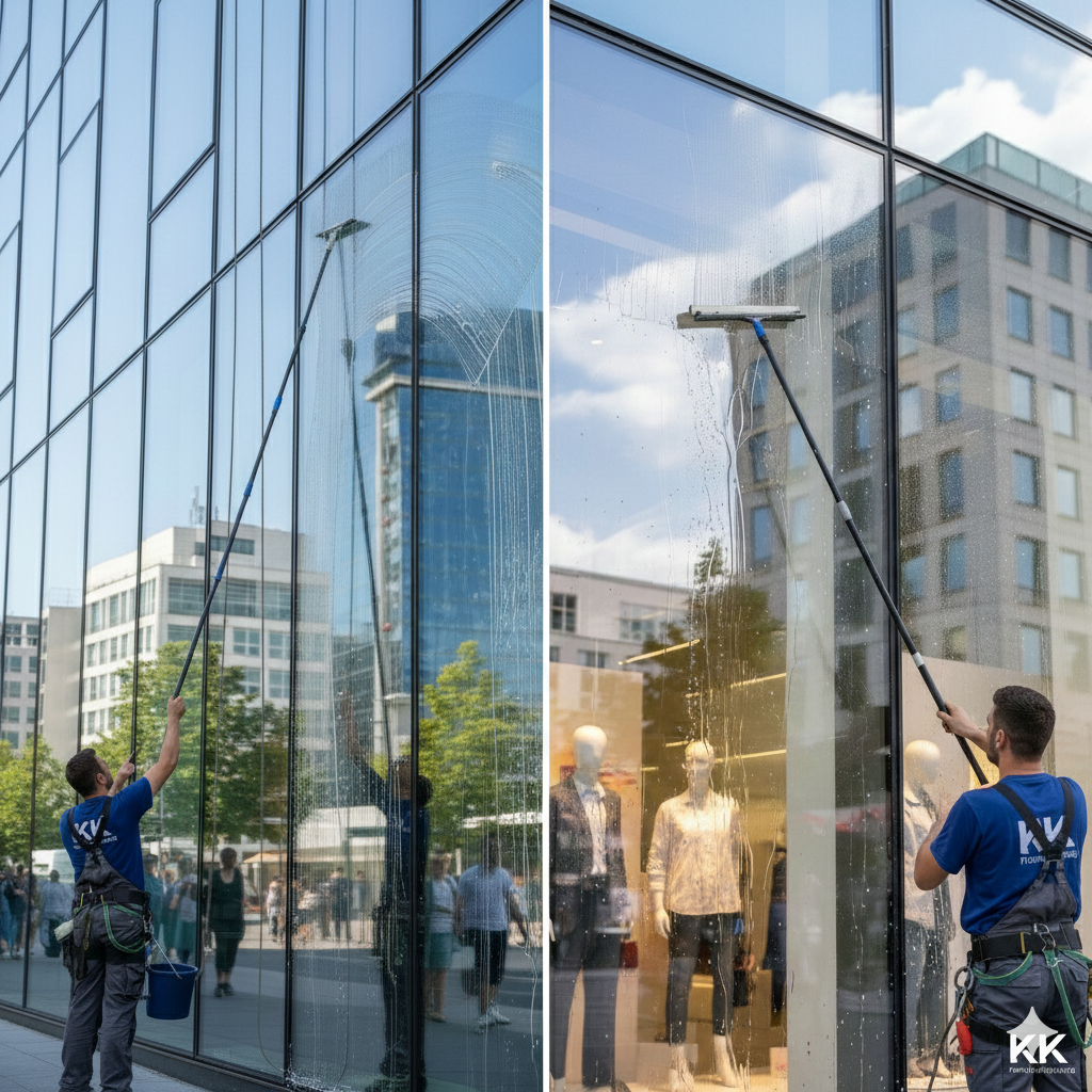 Fensterreinigung ist mehr als nur Glas putzen. Unterschiedliche Glasarten, Rahmenmaterialien und Höhen erfordern Erfahrung, Technik und Sorgfalt. Bei K&K Facility Management verbinden wir professionelles Equipment mit geschultem Personal und klaren Abläufen.